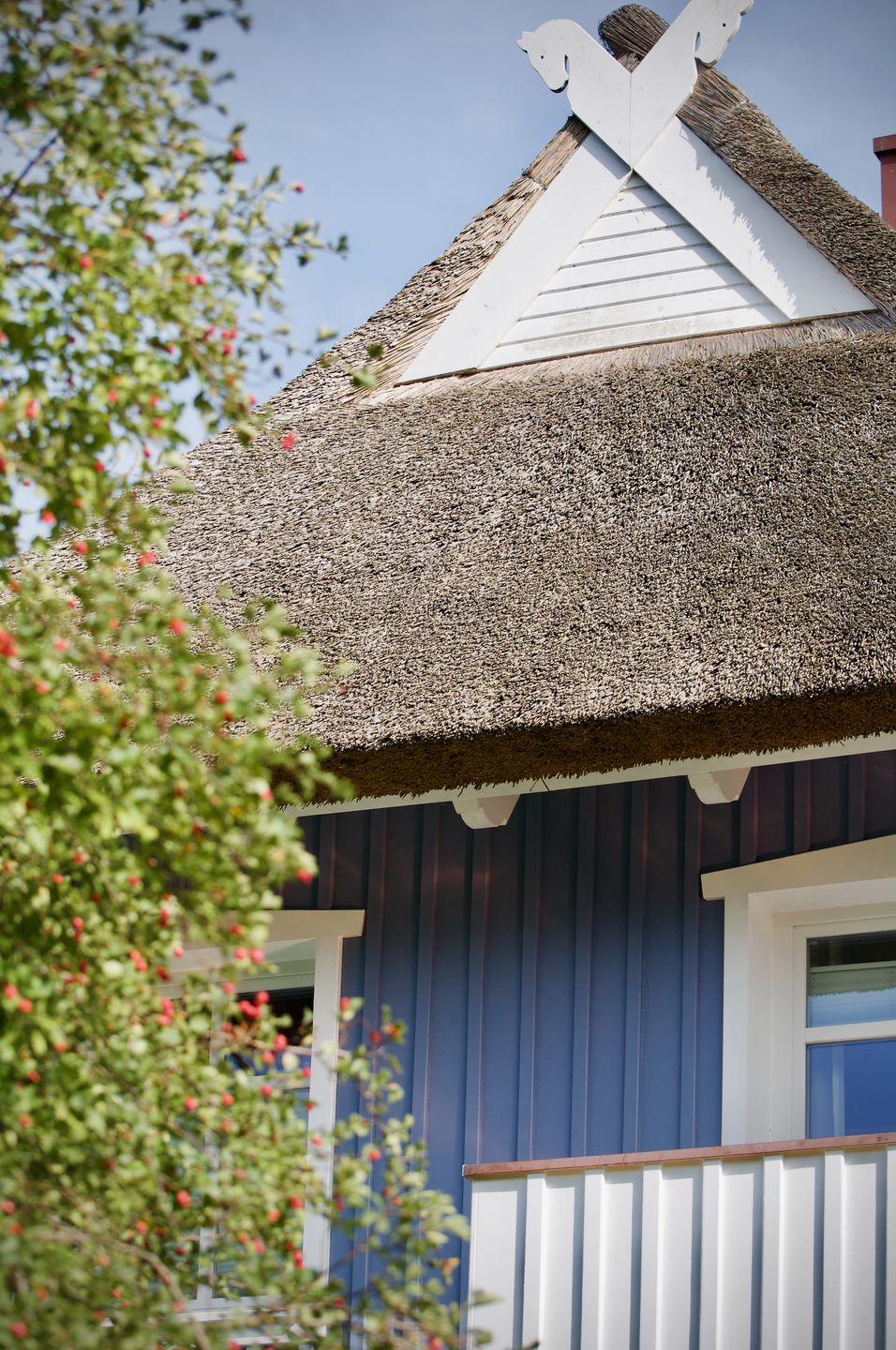 Exklusive Gemütlichkeit trifft auf moderne Ausstattung und viel Raum zum Durchatmen: Das reetgedeckte Haus Meerblau bietet Platz für bis zu sechs Personen und unterteilt sich in ein großzügiges Wohnhaus sowie ein separates Saunahaus. Die private Wellnessoase mit großer Klafs-Sauna, eigenem Ruheraum und viel Platz zum Entspannen macht besondere Auszeiten möglich.